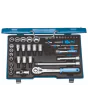 50 deler, vanadiumstål, EN ISO 6789, 1/4" og 1/2" tilkobling, GEDORE blå stålveske, dimensjoner 425 x 277 x 55 mm, vekt 6,22 kg