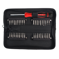 - Inneholder flere størrelser og typer skrutrekkere eller bits