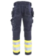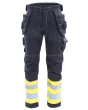Metallfri, inherent flammehemmende, komfortabel tekstil, EN ISO 11612, EN ISO 11611, EN 61482-1-2, EN IEC 61482-1-1, 45% modakryl, 35% bomull, 18% polyamid, 2% antistat, forsterkede hengelommer, stikklommer, baklommer, lårlomme, justerbare kneputelommer